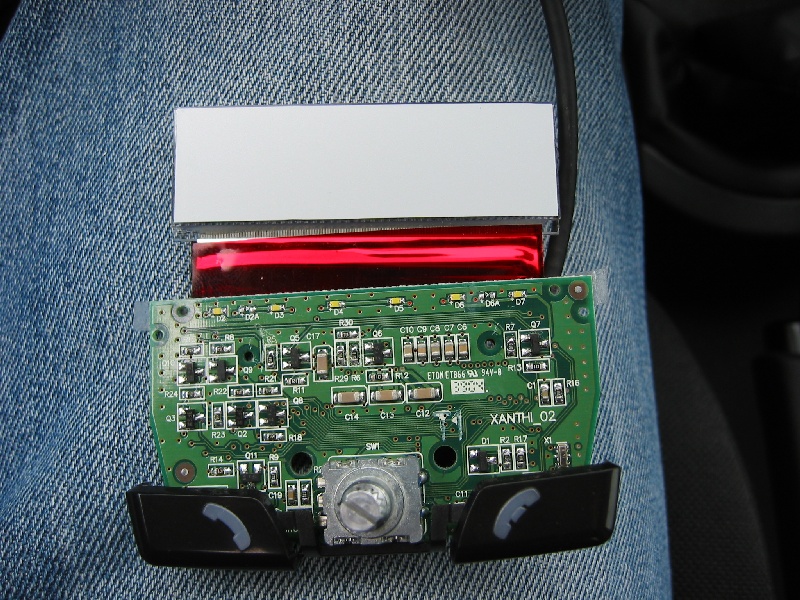 Hier mein erster Versuch, eine passende Folie auf die 6 LEDs aufzulegen. Es stellte sich jedoch beim Funktionstest als problematisch heraus, da die LEDs auch über die reflektierende Folie, an der das Display hängt (über der Folie), ans Display leuchten. Deshalb war die Beleuchtung teilweise rot, teilweise aber immer noch weiß, da die LEDs hinter der Folie und über die Folie reflektiert weiterhin weiß waren. |